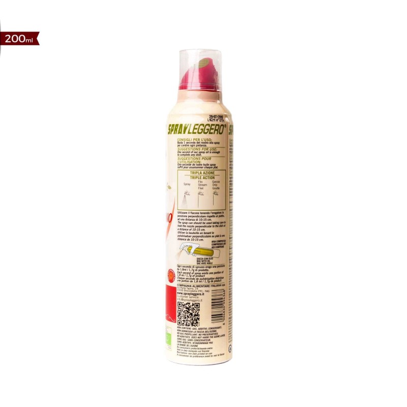 Thanks to the "bag on valve" technology, the special Sprayleggero can allows a consumption reduction of about 90% (a 250ml can in fact equals about a 3-litre standard bottle of oil) and protects the contents from exposure to air and light for a long time. This enables all the fine properties of the condiment to be maintained unaltered and to be preserved as freshly pressed. Each second of spray emits 1,8 ml/1,7 g (15 Kcal) of product enough to season any dish.