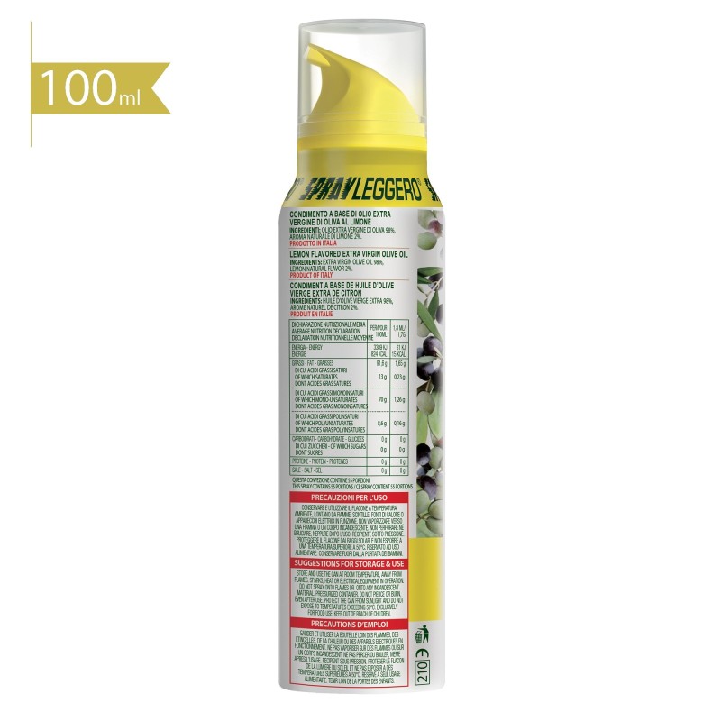 Thanks to the "bag on valve" technology, the special Sprayleggero can allows a consumption reduction of about 90% (a 250ml can in fact equals about a 3-litre standard bottle of oil) and protects the contents from exposure to air and light for a long time. This enables all the fine properties of the condiment to be maintained unaltered and to be preserved as freshly pressed. Each second of spray emits 1,8 ml/1,7 g (15 Kcal) of product enough to season any dish.