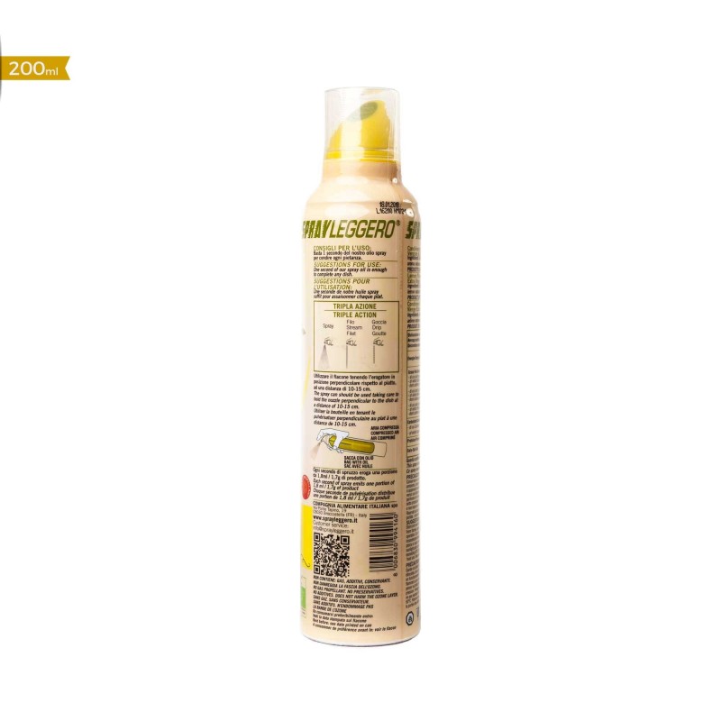 Grazie alla tecnologia "bag on valve", lo speciale flacone Sprayleggero permette di ridurre i consumi del 90% circa (un flacone da 250 ml equivale infatti a 3 litri circa di una normale bottiglia di olio) e di proteggere il contenuto da aria e luce per lungo tempo. Ciò consente di mantenere inalterate tutte le pregiate proprietà del condimento e di conservarlo sempre fresco come appena spremuto. Ogni secondo di spruzzo eroga 1,8 ml/1,7 g (15 Kcal) di prodotto sufficienti a condire ogni pietanza.