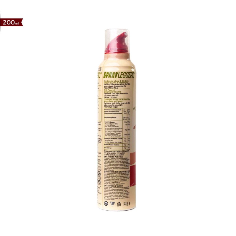 Grâce à la technologie “bag on valve“ le flacon spécial SPRAYLEGERRO permet de réduire les consommations du 90% environ (un flacon de 250 ml. vaut en effet à 3 litres environ d’une normale bouteille d’huile) et de protéger le contenu de l’air et de la lumière longtemps. Ça permet de maintenir inaltéré toutes les propriétés fines de l’assaisonnement et de le conserver toujours frais comme pressé au moment. Chaque second de vaporisation fournit 1,8 ml. /1,7 g. (15 Kcal) de produit suffisant à assaisonner tous les mets.